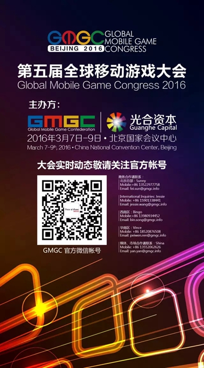由全球移动游戏联盟GMGC主办的第五届全球移动游戏大会GMGC2016,将于2016年3月7日至9日在国家会议中心CNCC(北京)举办,为期三天。本届大会将力邀来自全球移动游戏及其相关产业的精英人士参与。