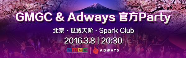 由GMGC组委会与独家赞助商Adways联合举办的GMGC大会官方Party将于3月8日晚在京举行,届时将由来自全球移动游戏及相关产业的超过600名精英人士齐聚顶尖俱乐部Spark,在京城最Hot的地方举杯共饮,探索全球移动游戏行业的合作与供应,携手迎接2016游戏行业的美好未来!