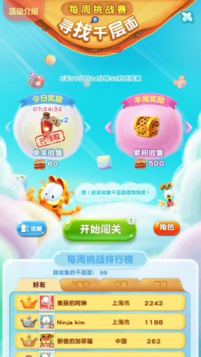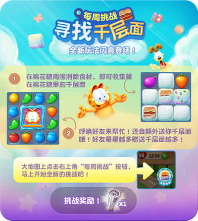 1月20日,《加菲猫爱消除》再次更新游戏版本,此次更新最为重要的,是加入了新的周挑战机制:寻找千层面。