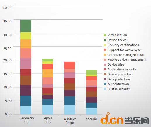 具体得分方面,黑莓OS7获得了安全方面的最高分2.89,而iOS5得分为1.7,WP7.5分数为1.61,Android2.3垫底,得分仅为1.37。