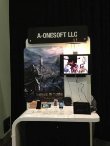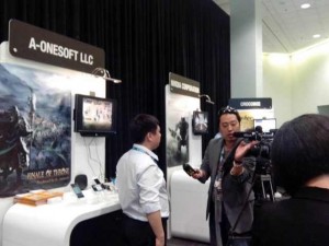 在E3游戏展手机游戏展示区,A-onesoft的展台展示了最新手游产品《天下》、《帝国》、《嫂嫂莫打脸》以及《宝石疯狂》、《zombie smasher HD》、《疯狂的熊猫》等热门产品。同时,在银屏上展示着最新手机游戏产品的宣传视频,精彩的视频和超好玩的游戏体验,令许多人驻足关注。
