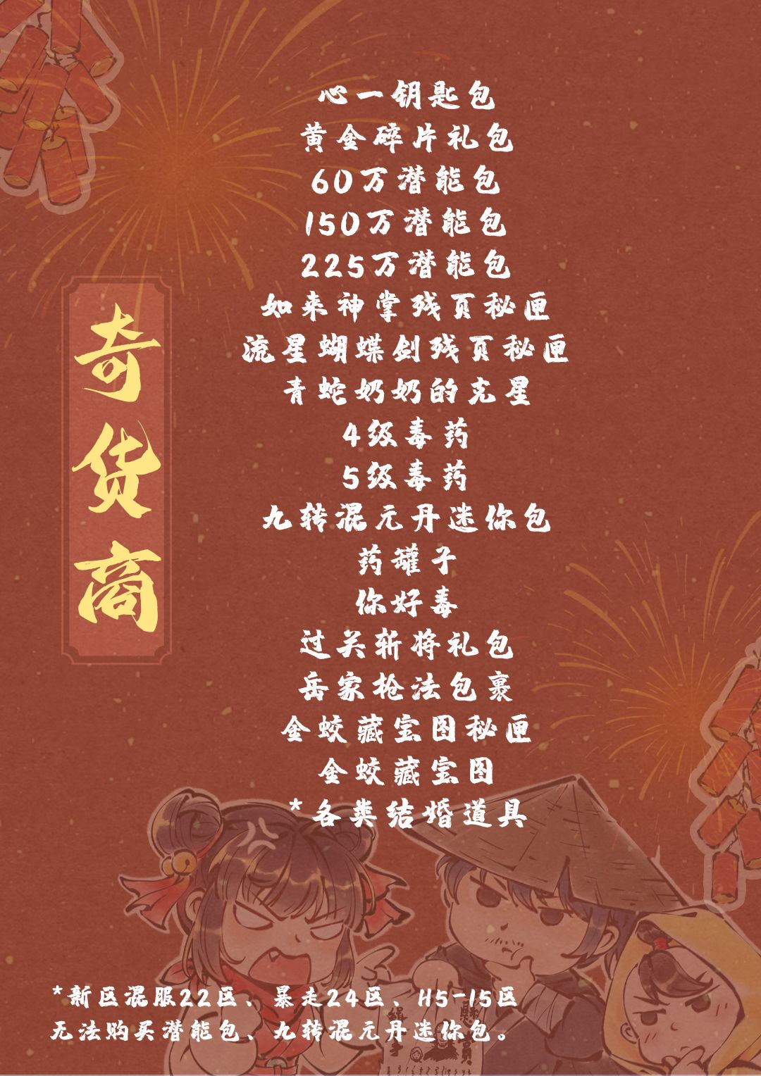 奇货商处引进了不少好东西,有需要的少侠可前往购买。(新区混服22区、暴走24区、H5_15区无法购买潜能包、九转混元丹迷你包)