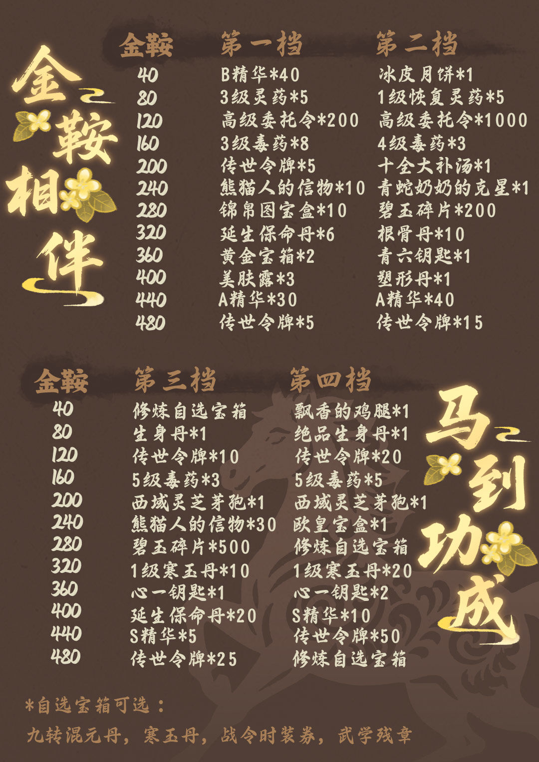 ■活动内容:活动期间,少侠通过完成日常活动可以获得活跃值【金鞍】,收集的【金鞍】到达指定数量可以领取各类奖励。
