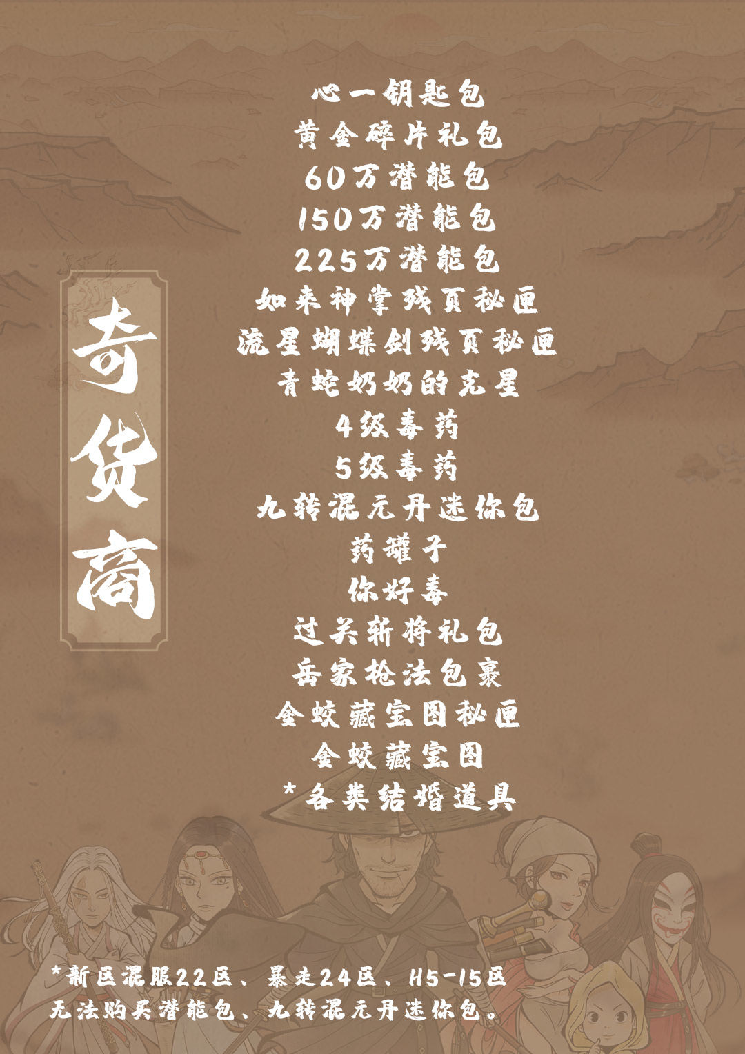 奇货商处引进了不少好东西,有需要的少侠可前往购买。(新区混服22区、混服23区、暴走24区、暴走25区、H5_15区无法购买潜能包、九转混元丹迷你包)