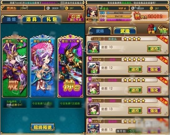 武将强化:游戏中,武将卡牌可以通过强化来升级,强化需要武将卡牌或者将魂。到达一定值后就会升级。
