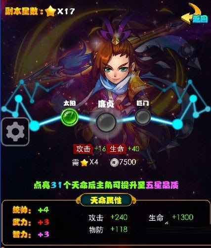 第二:就是上面所说的,当点亮到足够的天命时候会将主角提升至五星等级。