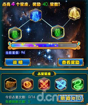 【占星介绍】 占星坛每天十点重置次数,而且奖励进度也会被重置。每天有16次的占星次数,一次只能点亮一颗星星。点亮四颗星星就可以获得20星数,如果没有凑齐之前的那些点亮只会获得一点星数。星数达到一定数量就可以换取想要的奖励。