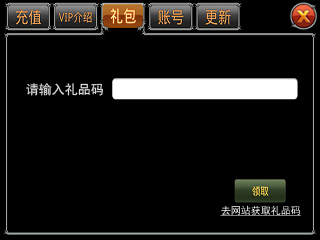 登陆游戏创建角色以后进入主城界面,点主界面右上角的充值按钮,或者点左上角的圆形图标都可以进入礼包兑换界面