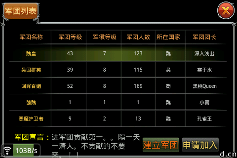 军团系统:简单的说其实就是帮派系统,通过加入军团和盟友们一起征战天下的感觉还是不错的,谁说得到了天下就会失去朋友,电视里都是骗人的,嘿嘿。