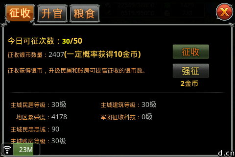 征收银币的时候也给了我惊喜,有概率获得金币,虽然数量不多,但是只要坚持,确实可以让大部分玩家体验游戏的所有功能,包括奢侈的武将培养功能。所以,努力的提高账房的等级吧。