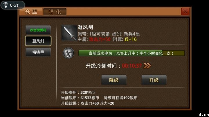 装备强化的概率是随着时间变化的,每半个小时变化一次,如果你不想浪费钱,可以等到100%升级概率的时候再点。不过即使失败了,也会有一定的银子返还,莫慌。其次,你还可能刷出一定概率连升两级的状态,这挺好的,我连着升2级升过4次。强化装备的CD到10分钟你就得等待了……