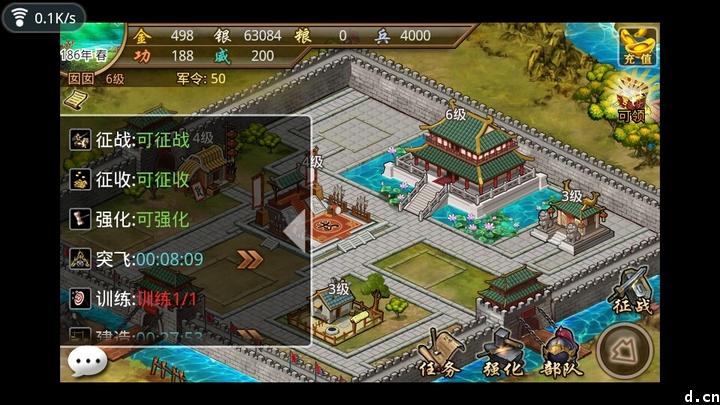 4.主城可以征收税,但是别急着征收,因为每天可征收次数是10次,而主城等级越高,账房等级越高收到的银子会越多,初期的时候不妨先升级一下主城,到大概12级瓶颈的时候再进行征收。