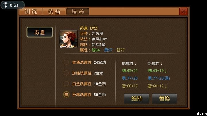 消耗军功或者金币,对伙伴的基本属性进行提升,金币消耗2-50金币一次不等。