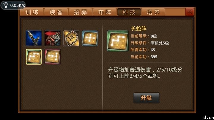 通过战斗获得,可以用于训练“突飞猛进”,也就是短时间内获得大量经验或者属性培养。当然,这是有CD的,满1小时就等着吧。军功也可以用来升级科技,科技包含普通攻击力、法术攻击力、阵法等级等。个人觉得,可能随着等级的提升会增加更多的科技供选择。