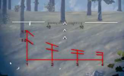上图是VSS自带的倍镜,由两部分组成,红色线条区域叫做距离参照系,直线部分对应的100米,200米,300米,400米,曲线部分则是对应人物的高度,两条曲线分别是站立和蹲下的高度。