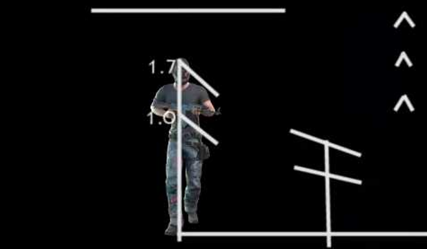 一个一百米外站立的敌人正好可以填满这一格,所以对一百米的敌人使用第一个三角的顶端位置当作准心,由于这把枪是亚音速武器,你可以看到子弹是呈抛物线形状射出,不过不用担心,只要校准方向,子弹就一定会命中敌人。