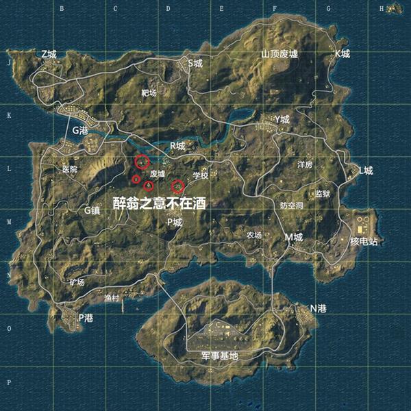 在降落废墟之后,对没有进水的外围建筑进行迅速的收集,在获得最基本的装备之后立刻向附近的野区转移;很多玩家估计会担心,因为附近地处宽阔,一旦遇袭,很可能因为没有掩体保护而被打死,但是实际上这种可能性并不高,我们再来看一下地图,废墟周围为G镇、P城、R城、学校,每一个都是大名鼎鼎的高级资源点,而这些高级资源点内的争斗也是非常的激烈的,至少在第一个圈缩完之前,很难有敌人能成功突围,并且就算有高手能够突围,他们为什么要来废墟呢?