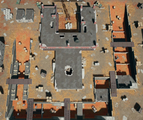 训练基地的整体布局第一眼看上去可能会觉的很乱,地形非常复杂不适合快速搜刮,其实这种看法是错误的哦。虽然训练基地看起来很杂乱,但事实上想要称霸整个训练基地,你只需要抢占中央的Y字形建筑物就可以了。