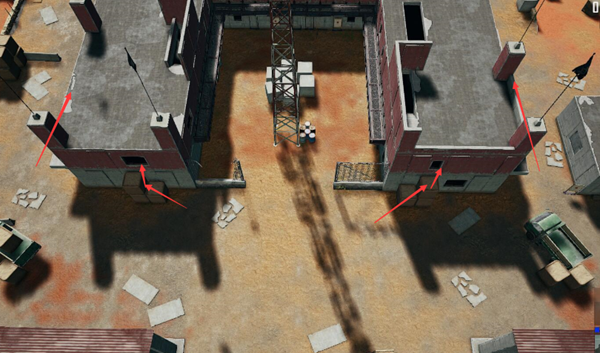 想要攻占这个Y字形建筑物,首先需要做的就是跳伞直接跳到楼顶的平台上。如果平台上的人不多,那就迅速捡枪干掉对方,再下跳二层。如果平台上的人太多了,就不要犹豫,速度下跳二层进行搜刮,躲过第一波的楼顶混战。