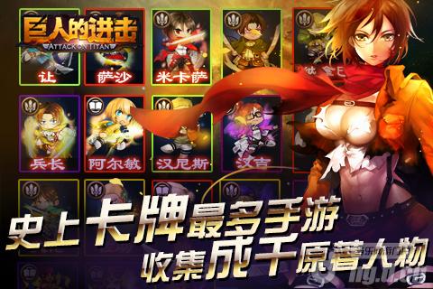 根据13年度最火爆漫画题材改编的《巨人的进击》,以卡牌收集养成、副本战斗为核心内容,采用卡牌战斗的经典方式,真实还原动漫中的人物角色和剧情。玩家们将回到被巨人控制的人类世界,与艾伦、阿明、三笠等小伙伴,大战铠甲巨人,抵抗凶残巨人的进攻,成为超级英雄 。