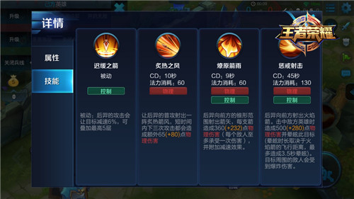 迟缓之箭(被动):后羿的普通攻击会让目标减速,并且可以和红BUFF叠加,可以起到非常稳定的减速效果,此技能配合红buff攻击对手,对手很难逃脱。