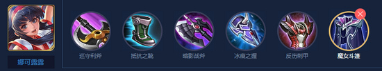 打野刀鞋子后,第一件出黑切,这件装备可以极大提高娜可露露的输出能力!在现在版本黑切削弱,但凶残之力降价,可以再黑切之后再补一件!然后是冰脉,带来的被动减速是非常好用的!第四件开始就是分水岭,根据局势选择防装还是攻击装。如果选择攻击装,唯二的选择就是破军和破甲弓。如果对方护甲堆得飞起出一件破甲弓性价比真心高。这里必须提一句破军,很多人说破军不平滑,两把风暴巨剑,1800块,绝对碾压其他任何输出装。因为什么暴击攻速娜可露露根本没用,1800以后等一个1000就可以做出神装破军,这其实性价比真的非常高。如果生存压力巨大,则根据对方的输出类型选择装备,如果是物理伤害强劲,不详是首选。如果法术伤害强劲则需要进行一个判断,如果对方法术伤害对你的伤害非常可怕,你出魔女!最后一件容错装,我非常建议复活甲。原因很简单,短CD类型的英雄复活甲显然比名刀更好,因为名刀一旦在你技能CD的时候触发,直接等于没有,而且橘右京普攻不带回血,很难像马可波罗那样叱咤风云,复活甲的2到3秒的时间能够给娜可露露的技能一个喘息。