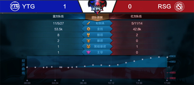 YTG与RSG前期经济差距不大,因双方都选择了自由人体系的两大核心英雄分别为,YTG选择李元芳,RSG选择了马可波罗。但从中期YTG方开始发力,李元芳配合中、辅入侵敌方野区抢资源,一旦对手反攻,上路刘邦可及时支援以多打少必然占据优势。从13分36秒开始双方经济慢慢拉开,YTG方装备领先最终通过装备压制完美团灭对手拿下胜利。