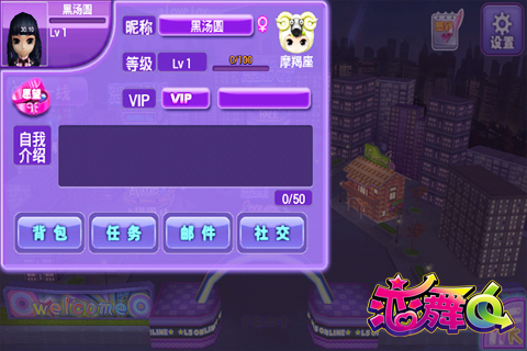 人物属性界面包括了许多内容,角色的头像、昵称、等级、星座、性别、我的愿望、自我介绍,而且还拥有背包、任务、邮件、社交四大功能的入口。