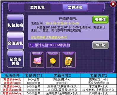 充值满100元,就可获得3000金券+舞团创建卡*1+国庆纪念币*50;