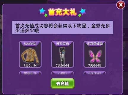 首次充值无论充值金额‘多少’都将瞬间拥有百元礼包,有精美服饰及无对外售的苹果果汁,同时立刻赠送充值M币等额的金券奖励。绝对超值!
