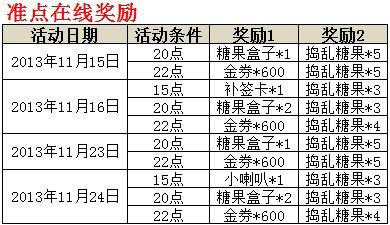 11月15日 20点准:糖果盒子*1+捣乱糖果*5;22点准:金券600+捣乱糖果*5;