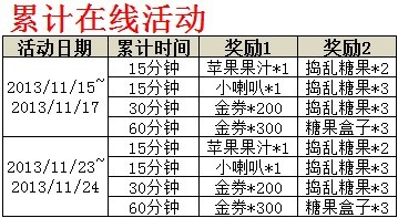3. 签到奖励:2013/11/15日~2013/11/29期间,累计3日签到可获得6个捣乱糖果;累计签到5日可获得12个捣乱糖果;累计签到7天可获得20个捣乱糖果!
