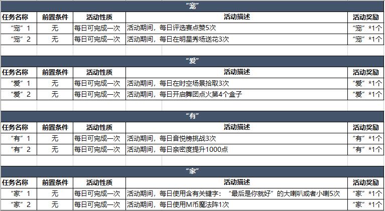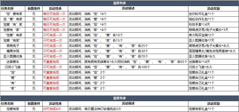 1. 完成“宠”“爱”“有”“家”系列任务可获得兑换道具“宠”“爱”“有”“家”