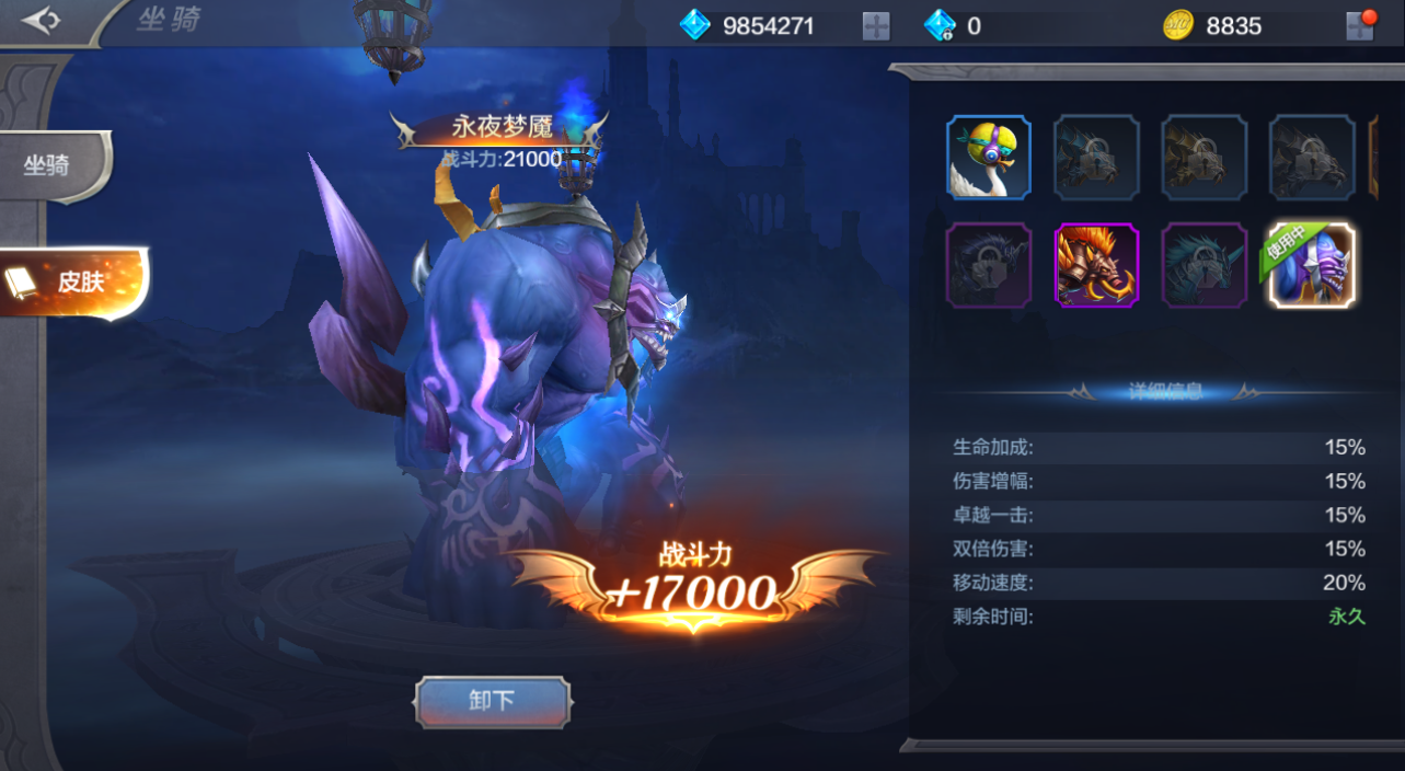 如果你拒绝墨守成规,那么可以通过坐骑皮肤来改变你的坐骑外观,每款皮肤的属性不同,获取途径也各有要求,玩家可以根据自身的喜好去获得! 在获得该皮肤后点击”使用”即可获得皮肤所带来的属性加成,回到游戏主界面,你的坐骑外形就发生了翻天覆地的变化。