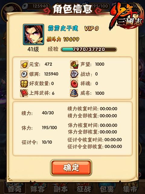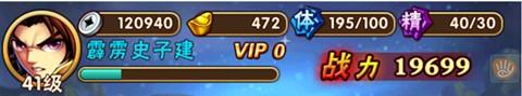 界面最上方一排从咱们帅气的主角头像往右看,分别代表了银两(游戏内用于强化装备等),元宝(可以用来抽将,以及购买各种道具哦),体力值(要是为0就不能打副本了呢),精力值(和其他玩家较量的时候需要有精力哦!竞技场挑战需要一定的精力值)。