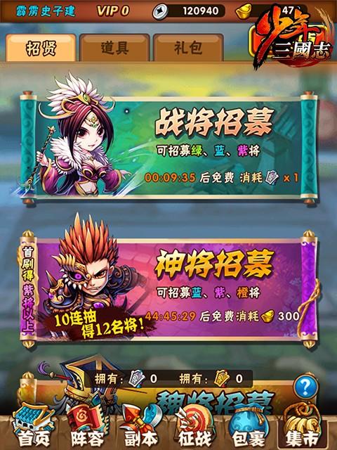 点击“集市”按钮后,首先看到的是武将招募的界面,通过点击对应的按钮进行不同的武将招募体验;点击此界面的“道具”页签则可以进行各种游戏内道具的购买;点击此界面的“礼包”页签则可以购买vip礼包。