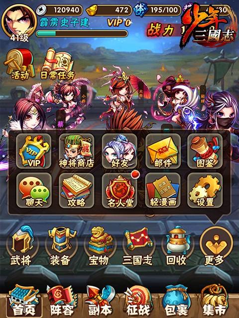 点击主界面的“更多”按钮后,可以看到剩余的一些功能,比如查看vip特权,进入神将商店,查看好友,查看邮件,查看游戏内现有武将的图鉴,进入聊天界面与其他玩家交流,查看攻略,查看名人堂玩家,欣赏轻漫画以及进行系统设置等。