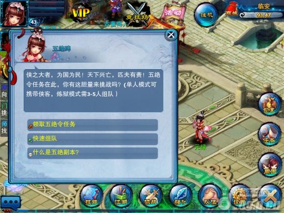 参与方法:每天玩家可以在临安找到“五绝碑”或者点击随身“活动”按钮领取五绝任务。