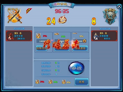 玩家可自行组成1-3人队伍参加,允许诸位侠士携带侠客参战。点击“阵营战”界面的“参战”按钮,则进入阵营战匹配,匹配过程中不允许发生任何人员更换、增加。队长离线则全体队员离开队列,队员界面也会随之关闭。阵营战是按照角色等级进行匹配,只匹配对方阵营的对手,首先匹配平均队伍等级与己方平均队伍等级相等的队伍,参加过“天下第一武道会”的侠士们相比会比较熟悉这种匹配战斗方式。