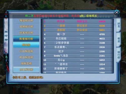 咳咳,在此继续温馨提醒一下诸位侠士,送花是不分性别的,没错,也就是诸位侠士既可以少侠送给侠女,也可以少侠送给少侠,人人都有机会登顶鲜花榜,只要你魅力足够。只有当玩家登上鲜花榜,就会收到系统提示:“恭喜恭喜啊,果然是人见人爱,车见车载,你已经荣登今日鲜花榜了,赶快去看看吧。”