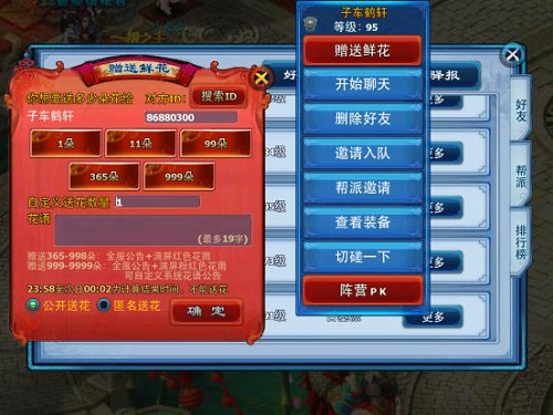 好啦,诸位侠士通过各种努力,手上已经有了大把的鲜花,等着砸向,不,是献给自己心仪的某人。这个时候侠士只需要点开收花人的交互界面,选择“送花”按钮,便可以送出鲜花啦,有1朵、11朵、99朵、365朵、999朵五个选项。友情提示一下,选择365朵和999朵将有系统公告,将侠士你的爱意昭告天下哦。