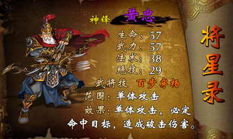 作为五虎将之一的黄忠,拥有和关羽相同的攻击范围,且附加特效为百分百命中和破击1手,百分百命中决定了对方不可闪避,鬼谋的特点是闪避高,这个特效无疑是贫血鬼谋的噩梦;破击效果则减少对方格挡几率,魂卫看到黄忠也要头疼。