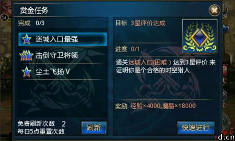 赏金任务难度分为一到五级,用星级标注,如果列表里的任务等级太低,你可以刷新,看能否刷到三颗星以上的,不过一天就两次免费刷新的机会,想获得更多的奖励,只能祝你好运咯!