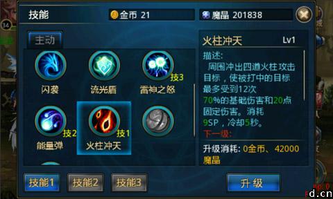 随着等级的提高,雷神之怒,能量弹,火柱冲天都可激活,后期就用这三个技能,相当给力,同样,有魔晶了记得提升等级,异能者的群攻真是超爽超刺激。