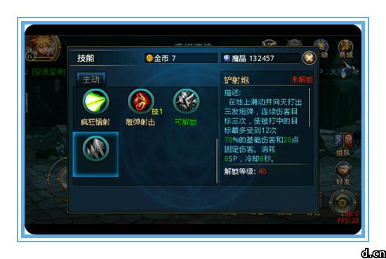 铲射:控制技能,将敌人铲向天空,然后发出3发炮弹进行打击。个人觉得,PK必备,既可用来控制并伤害对手,必要时也可用于逃逸,比什么后跳击给力得多。