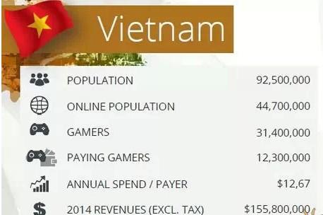 有关报告显示,越南在世界发展最快的智能手机市场排名第二(259%),越南移动手机的总量是1.273亿/9千万人口,里面有1700万是智能手机,每年也会有很多新的增量。2013年在越南智能手机游戏的收入大概2500万美金/月。