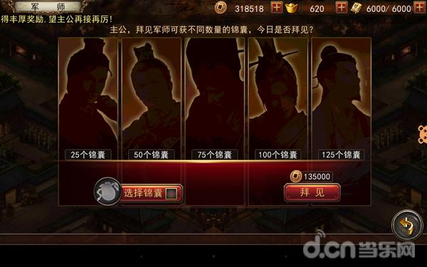 锦囊:在“拜见军师”玩法中,玩家消耗部分金币便能换取随机一种锦囊,25个、50个、75个、100个、125个不等。如果勾选了你想要的一种锦囊,就需要元宝许愿了,数量上也会缩减至五分之一。