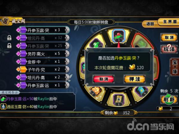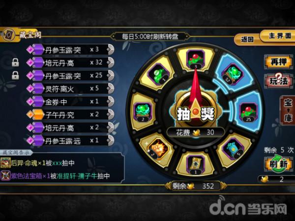 在藏宝阁中的左侧列表可以看见本轮转盘内的所有宝物,点击可查看对应宝物介绍。宝物每天5点都会更新,自然也可以花费少量元宝直接刷新。在抽取前,需要先在右侧转盘上押注自己想要的宝物,然后点击抽奖即可转动转盘,转盘停止之后,若指针指中所押宝物,自然归你所有。
