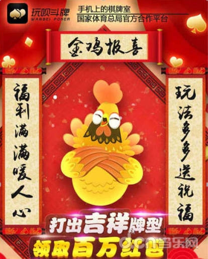 新春佳节,十万人火爆的在线手机棋牌室-玩呗斗牌,给大家提前拜年啦!正值2017年鸡年春节来临之际,玩呗斗牌借“鸡”谐音“吉”推出:“鸡”祥年,送吉祥,打出吉祥牌型,领百万红包的活动,给玩家带来超级福利。