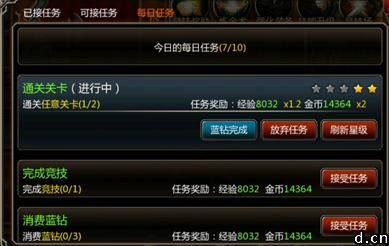 就从登录游戏之后开始说吧。不知道大家登录游戏之后做的第一件事是什么。刚开始我每次都是一登录就迫不及待地去刷图,做任务,升级。当然也有可能有人是点开各种登录奖励。喜滋滋的去强化装备,点亮星座等等。但是,有一个细节可能大家没有注意到,那就是任务中有一个每日任务,那里每天都会提供10个任务供大家去完成。好吧,可能有的人并不在意,觉得错过了也没什么,那么我们就来看看不做每日任务到底损失了多少。